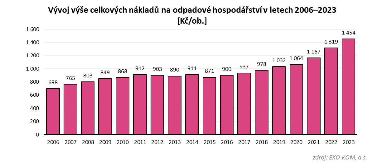 Zajímavý je také pohled na vývoj výše celkových nákladů v čase. Zatímco v roce 2006 platily obce České republiky v oblasti odpadového hospodářství v průměru 698 Kč za jednoho občana, v roce 2023 tato částka činila už 1 454 Kč. Především v posledních šesti letech lze pozorovat konstantní výrazný růst, podpořený v posledních letech také výraznou inflací.