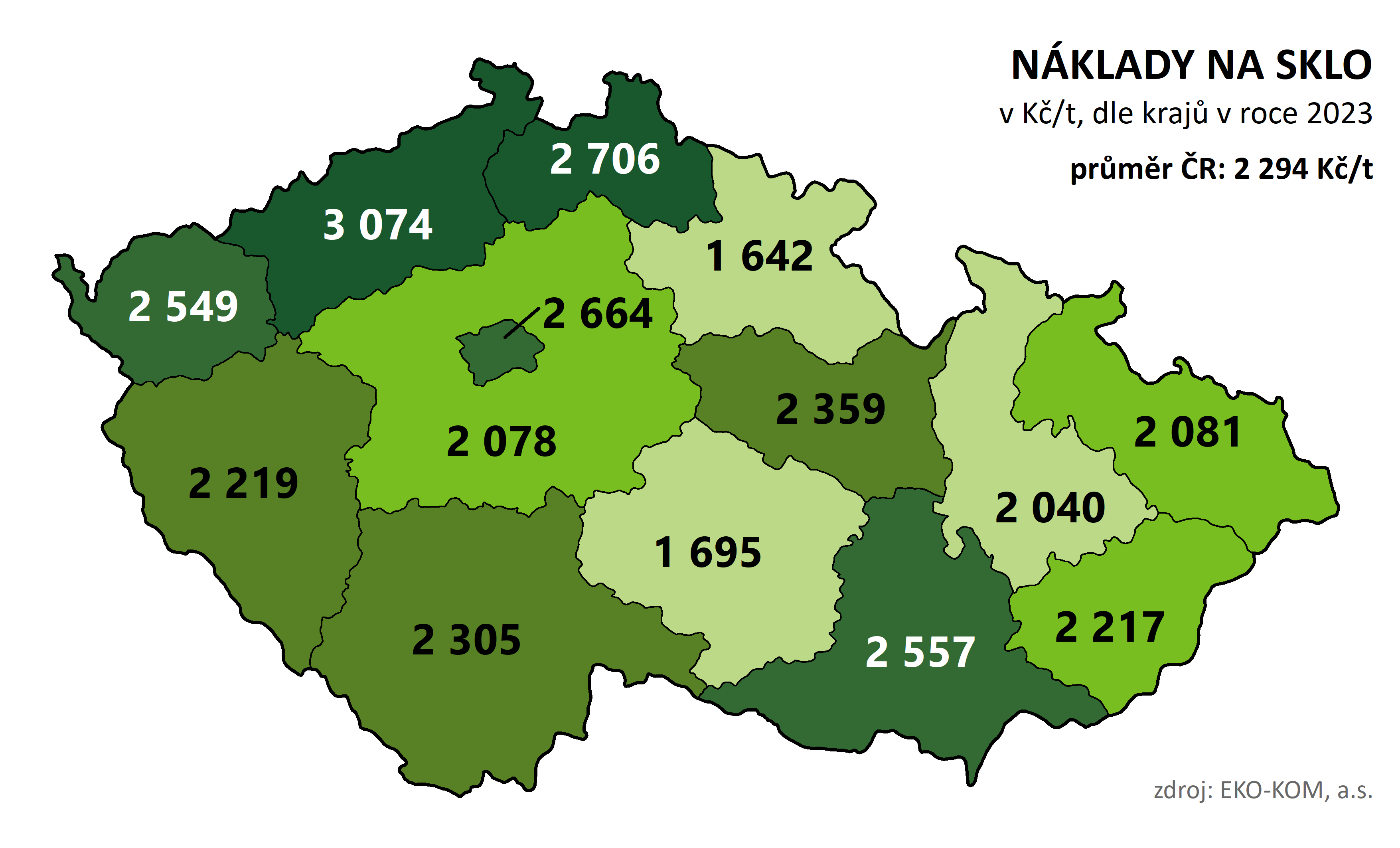 V roce 2023 byla výše nákladů na sběr a svoz papíru 6 612 Kč za jednu tunu sebraného materiálu, náklady na plast činily 10 156 Kč/t a náklady na sklo byly 2 294 Kč/t.