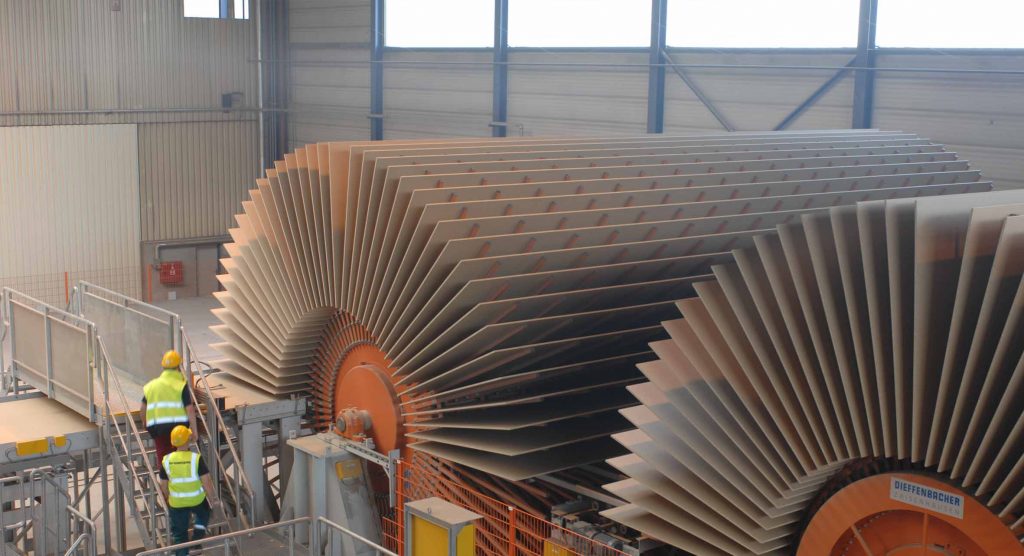 Recyklační věží však celý proces zdaleka nekončí. Získané třísky, vhodné pro výrobu, stále obsahují drobné nečistoty a také velké množství vody. Než vstoupí do vlastní výroby, musí se její podíl snížit až na cca 2 % hmotnosti. Tento proces probíhá v sušárně, ohromném rotačním válci, který je vytápěn biomasou (zejména dřevem nevhodným pro samotnou výrobu), ve kterém třísky stráví několik desítek minut. Následně se přesunou ještě na vibrační síta, kde se zbaví posledních prachových a minerálních nečistot. Takto připravené třísky se umístí do sila, které slouží jako zásobárna pro samostatnou výrobu, která probíhá v oddělených prostorách.