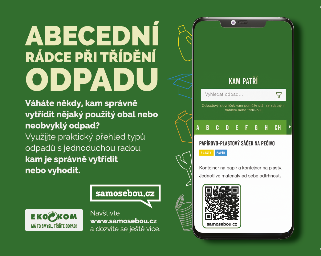 Inzerce určená k propagaci aplikace Kam třídit, která slouží k nalezení nádob na tříděný odpad a sběrných dvorů v okolí bydliště. V rámci aplikace je navíc k dispozici praktický rádce Kam patří.